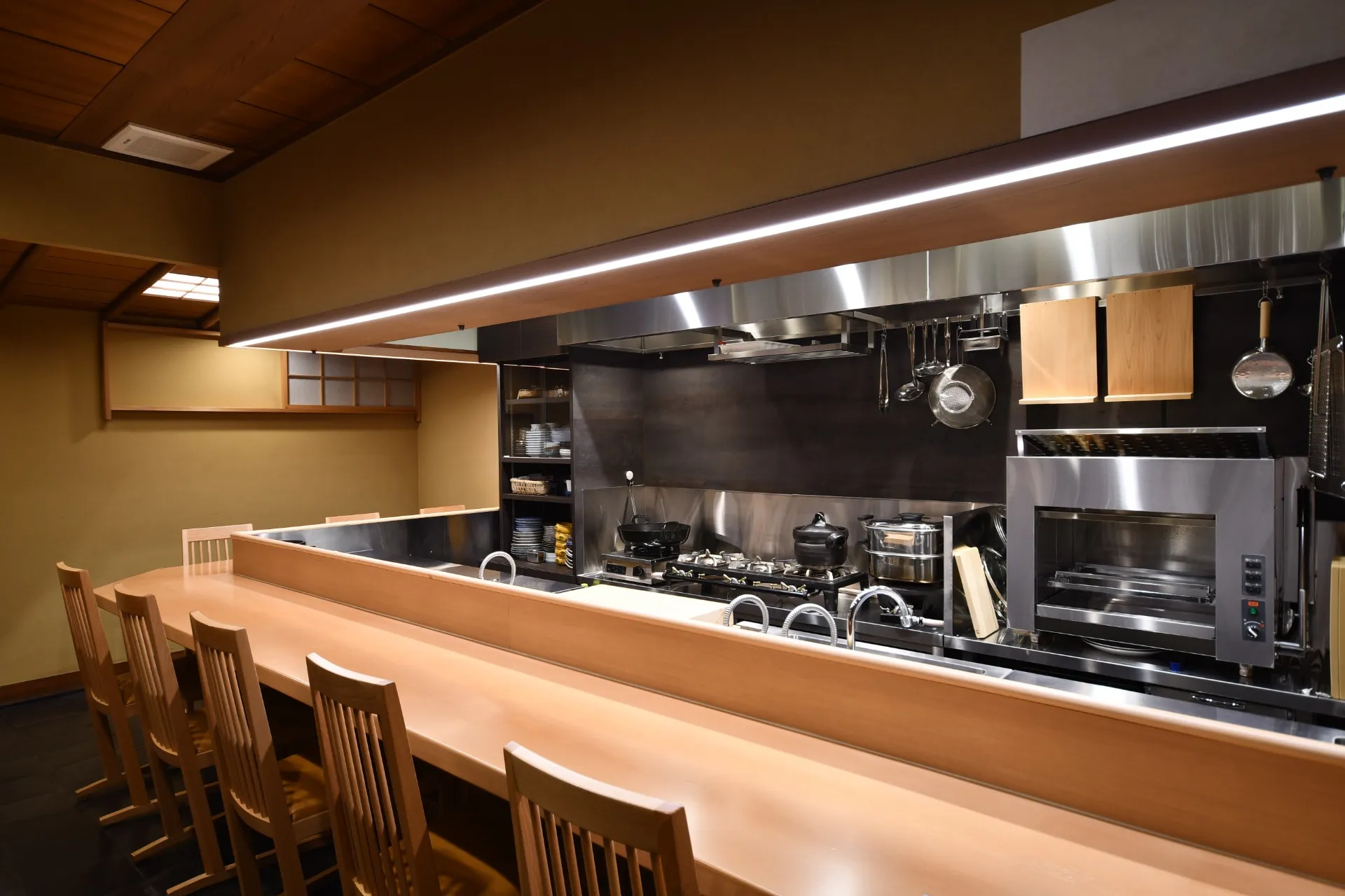 街の賑やかな雰囲気とは対照的に、隠れ家のようなお店が点在している中、伝統と革新を大切にするお店をオープンいたしました。お店の外観は控えめで、入り口はひっそりとしていますが、一歩足を踏み入れると温かく落ち着いた空間で、訪れてくださるお客様を赤坂で出迎えます。和の趣を大切にしながらもモダンな雰囲気です。